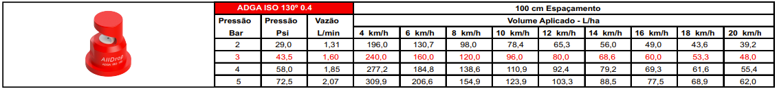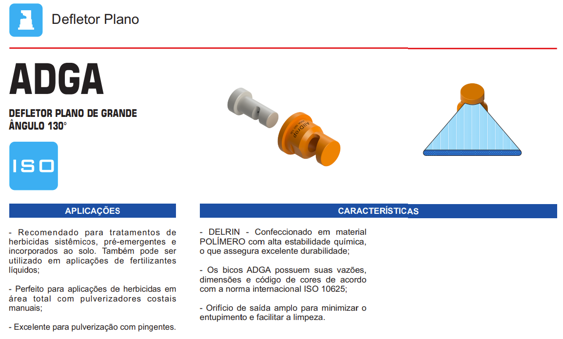- Os bicos ADGA possuem suas vazões, dimensões e código de cores de acordo com a norma internacional ISO 10625;
